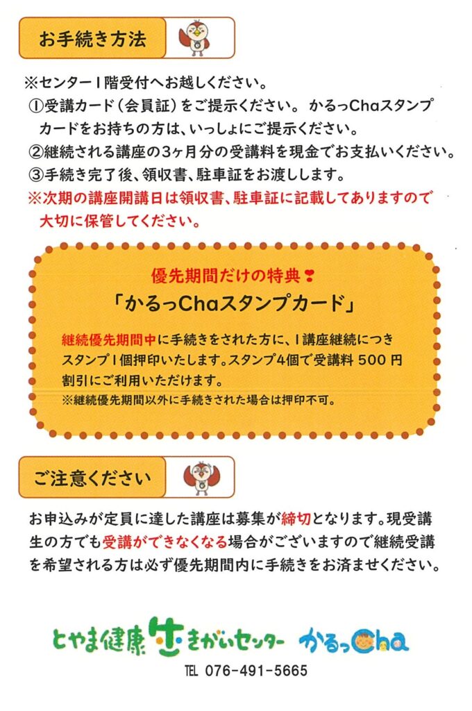 ※期間中のお手続きで1講座につきスタンプを1つ押印。4つためると500円割引券としてご利用いただけます。