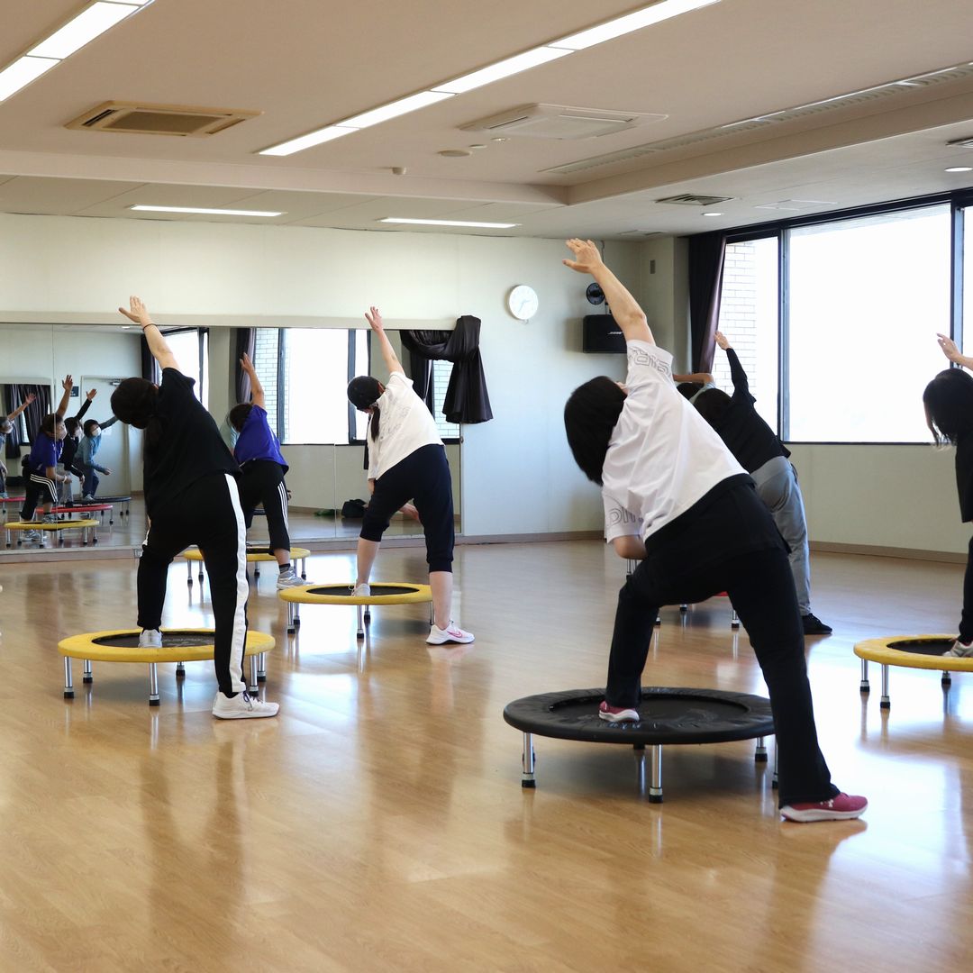 ミニトランポリンの上でウォーキング、筋トレ 全身を動かし体幹を整える事ができます。マイペースをモットーにどなたでも参加できます。